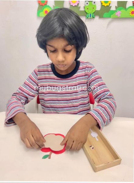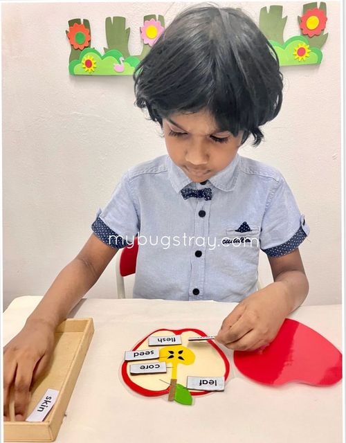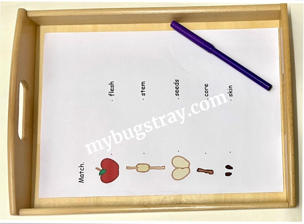 Rafael is really getting into learning about apple anatomy! He’s been practicing labeling all the different parts of an apple. It’s pretty impressive how much there is to know about such a seemingly simple fruit. Following their lesson on the Apple theme, my little one started matching and labeling parts of an apple accordingly.