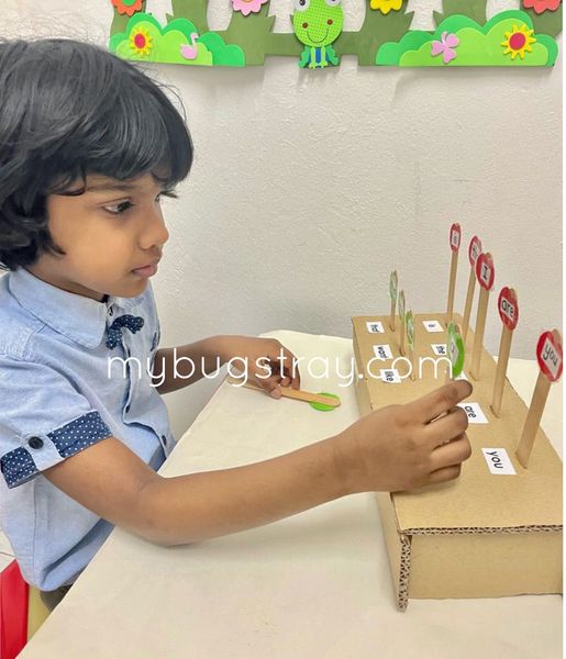 I used a carton box, popsicles, and sight words printable to make this simple activity. Find the similar sight words on the box and insert the right popsicles onto it.