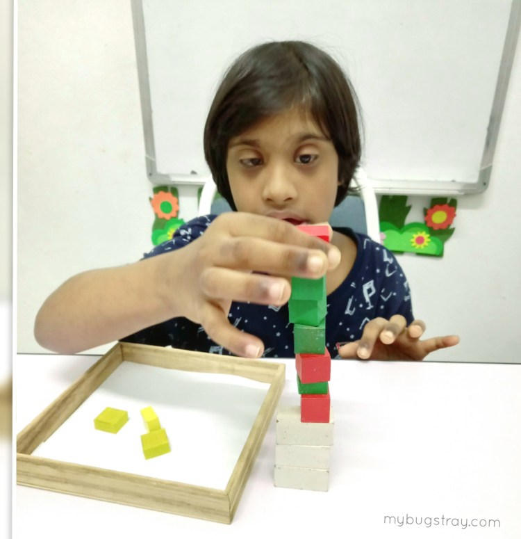 Raeyan has been doing stacking task ever since his early age, using bigger blocks to small wooden cubes. I love watching this little bug performing his activity with much confidence, concentration and the way he laughs when the blocks drop is just so amusing. It makes me to burst into laughter with tears.