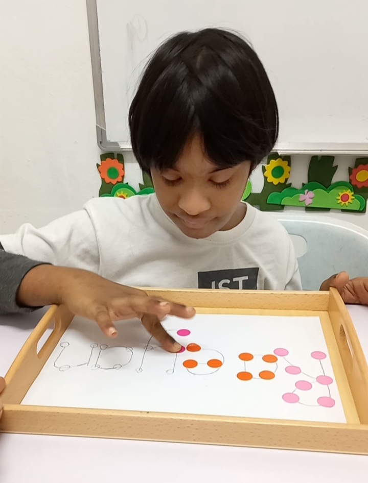 Wrote Raeyan’s name on a piece of paper and drew small circles around the alphabet for him to focus and paste the dots.