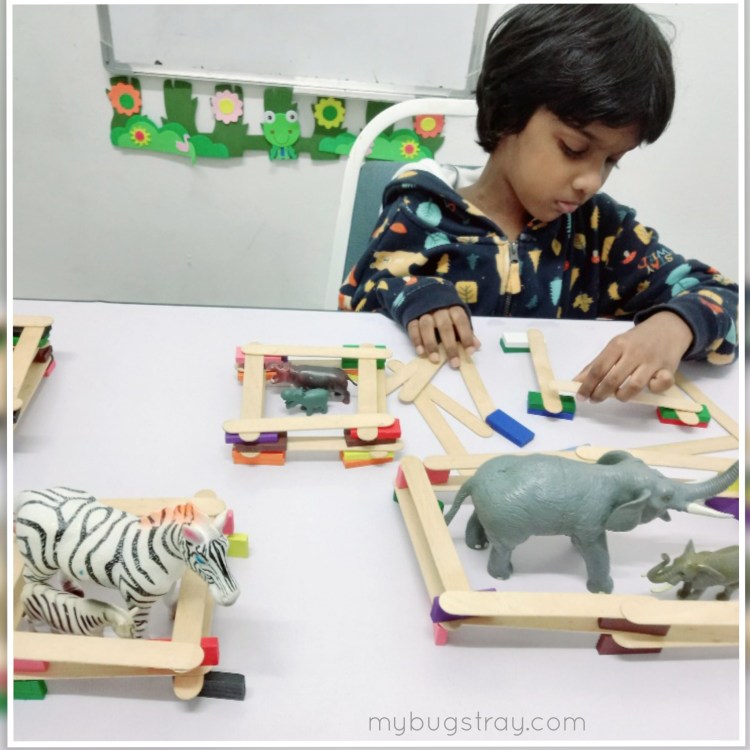 Building colourful zoo cages using mini wooden blocks and popsicles to keep the animals safe in their home.