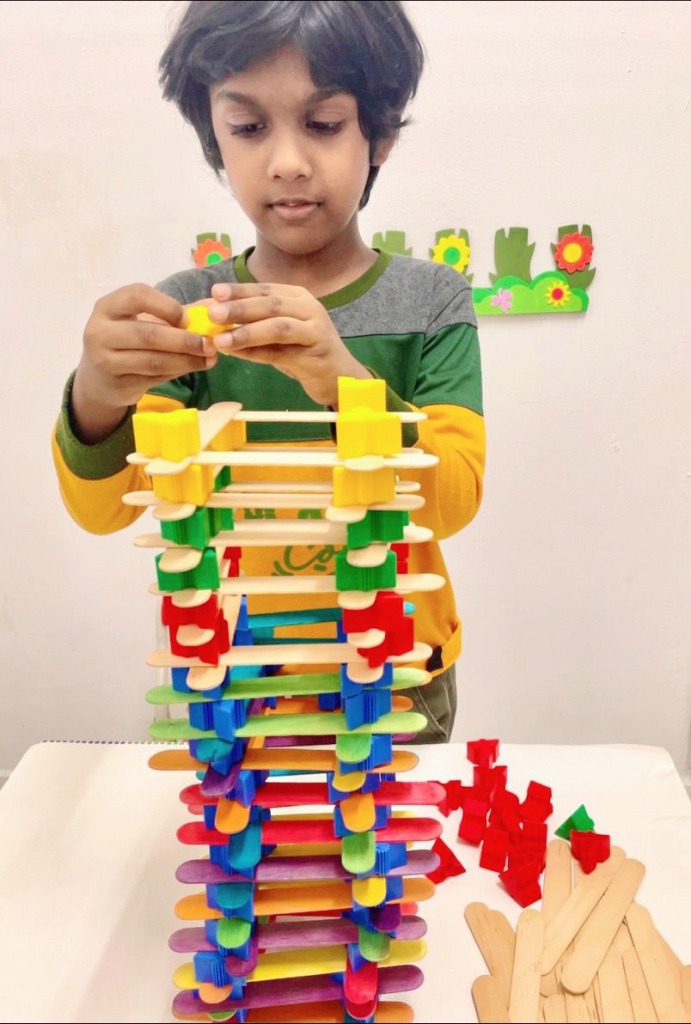 The building activity is an opportunity for kids to enhance their motor skills. They could improve their problem-solving skills, balancing and mathematics at the same time. When a child stacks the blocks and popsicles to make vertical towers or laying them on the floor horizontally, they show progress in their building skill, hand and eye coordination.