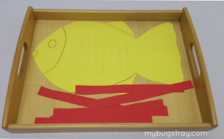 Weaving the scales of the fish. It requires more patience and concentration to complete this artwork. Rafael had shown much concentration during the activity, while inserting the stripes and pulling it out gently.